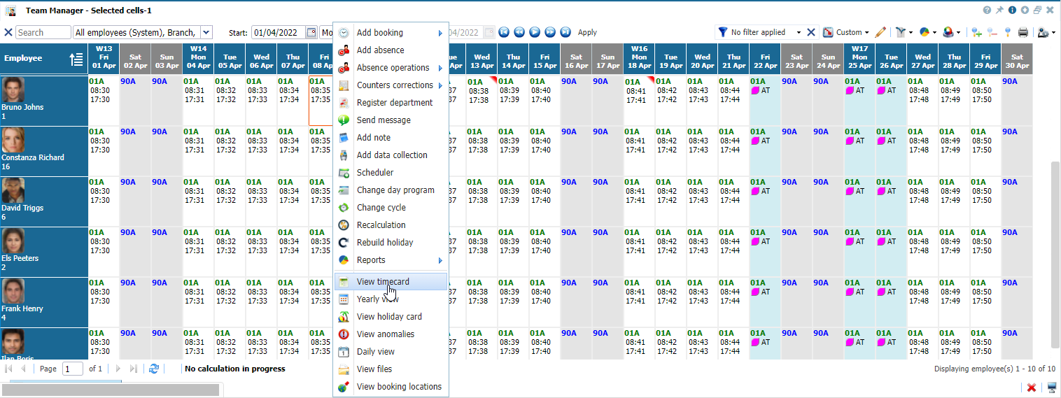 To add a booking for one or multiple days in Time Card from Team Manager, go to Operations - Team Manager, right-click on an employee cell and click View timecard.