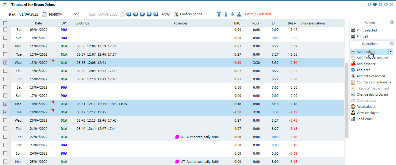 This will open the timecard of the person. Select the days you want to add bookings for and click Add booking: