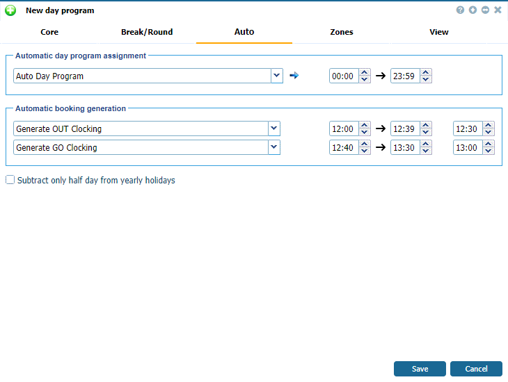 Here you can assign an automatic day program to your default day program and also define automatic bookings. Having an auto DP assigned to the default day program, one employee can switch between day programs automatically, but they still have a default day program to be applied in some cases (when one is absent, for example, or when their presence is out of auto DP). This is done taking into consideration the first booking, GO. If the GO booking is generated within a period of time set in the AutoDP table, this table will be activated; otherwise, the default day program is applied.