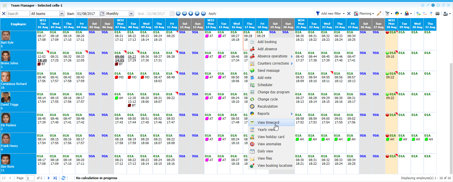 To add an absence for one or multiple days in Time Card from Team Manager, go to Operations - Team Manager, right-click on an employee cell and click View timecard.
