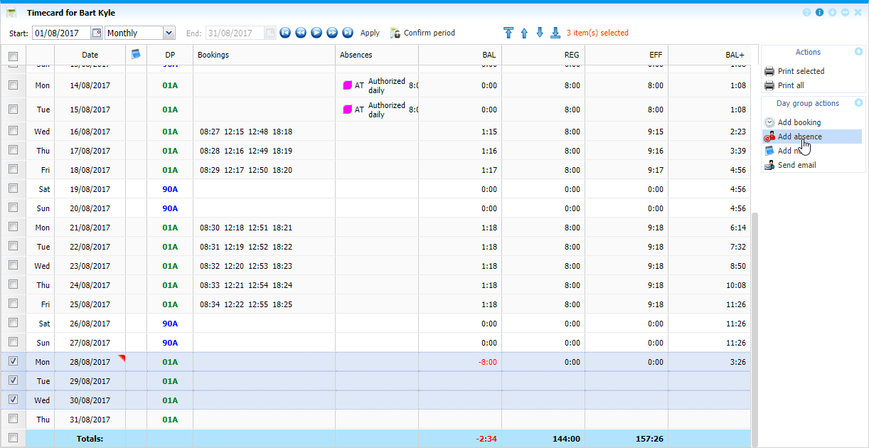 This will open the timecard of the person. Select the days you want to add an absence and click Add absence: