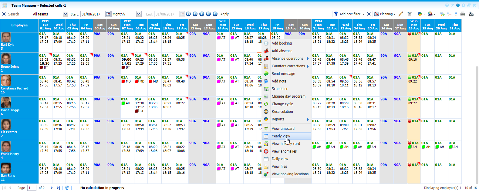 To delete an absence for one or multiple days in Yearly View from Team Manager, go to Operations - Team Manager, right-click on an employee cell and click Yearly view.