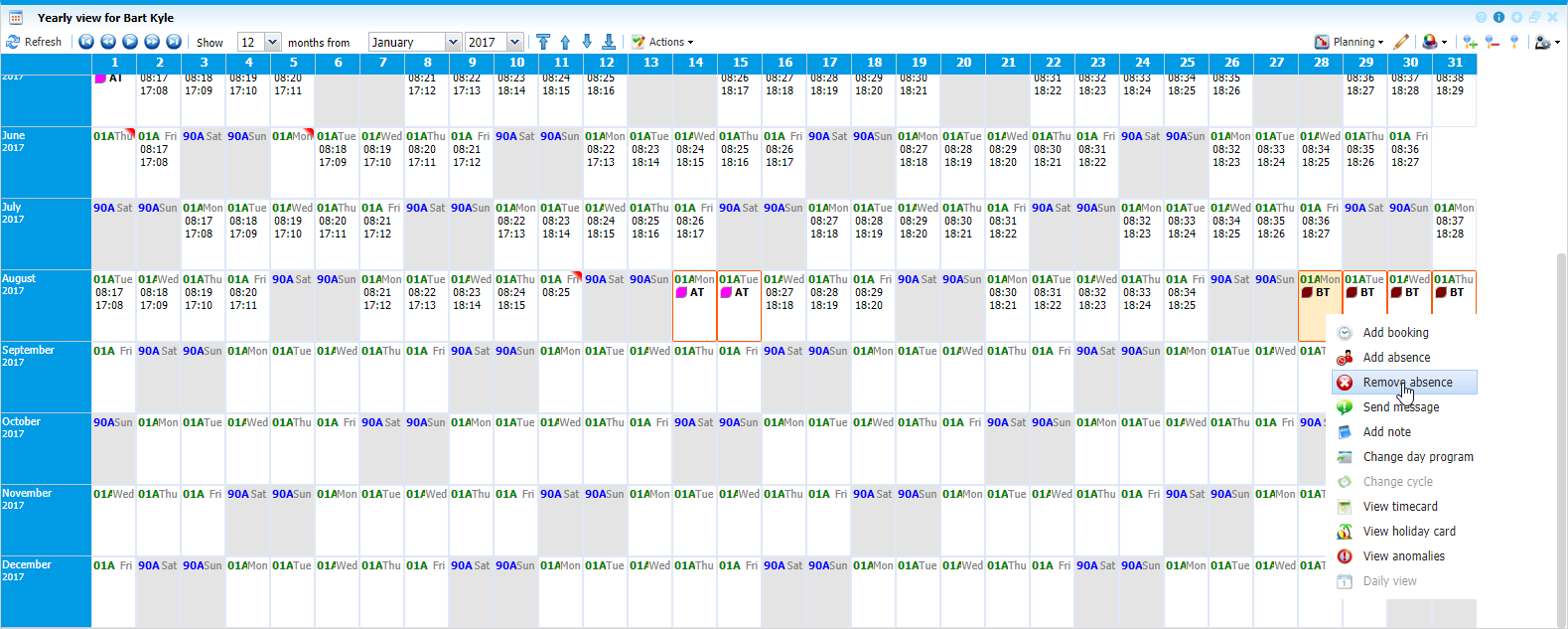This will open the yearly view of the person. Select the cells you want to delete the absence and click Actions -Remove absence (or right-click - Remove absence):