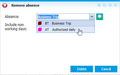 First criterion of absence removal is the type. If nothing else mentioned, Astrow will remove all the absences of a type defined and found in the multi-cells selected. Click to define also the authorization type as the second criterion for deleting the absence.