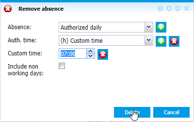 In case the authorization type is custom, you can also add the custom time as the third criterion of absence removal. Click to define the custom time. Astrow in this case will delete all the absences found in the multi-cells selected with the time equal with the custom time. If none defined, Astrow will delete all absences mentioned with authorization time type Custom.
