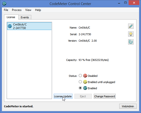 Step 2: Open CodeMeter Control Center. This can be done via Windows menu (Start - Programs CodeMeter - CodeMeter Control Center).