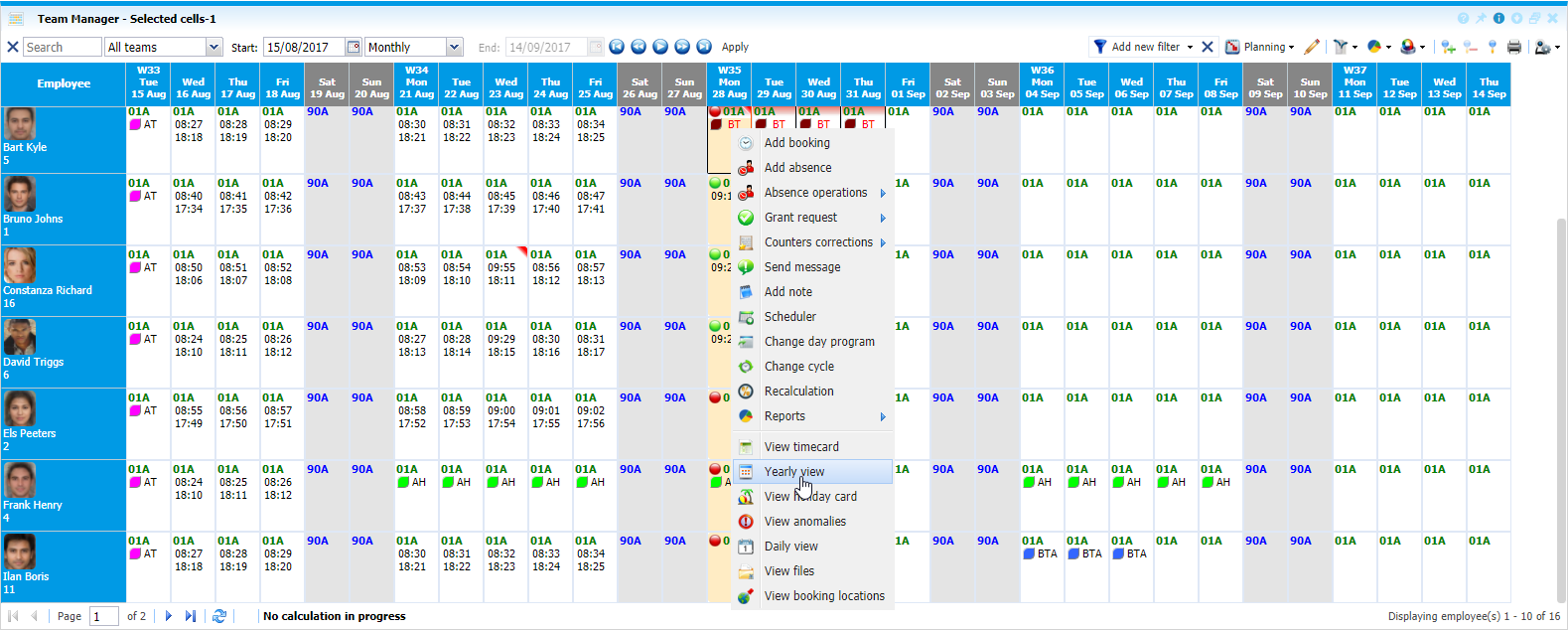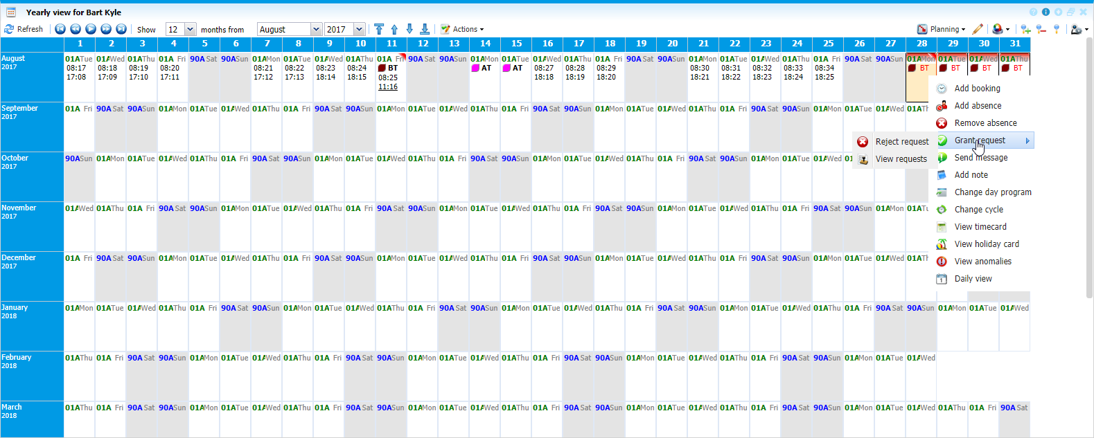 To grant/reject an absence request from in Yearly View from Team Manager, go to Operations - Team Manager, right-click on an employee cell and click Yearly view.