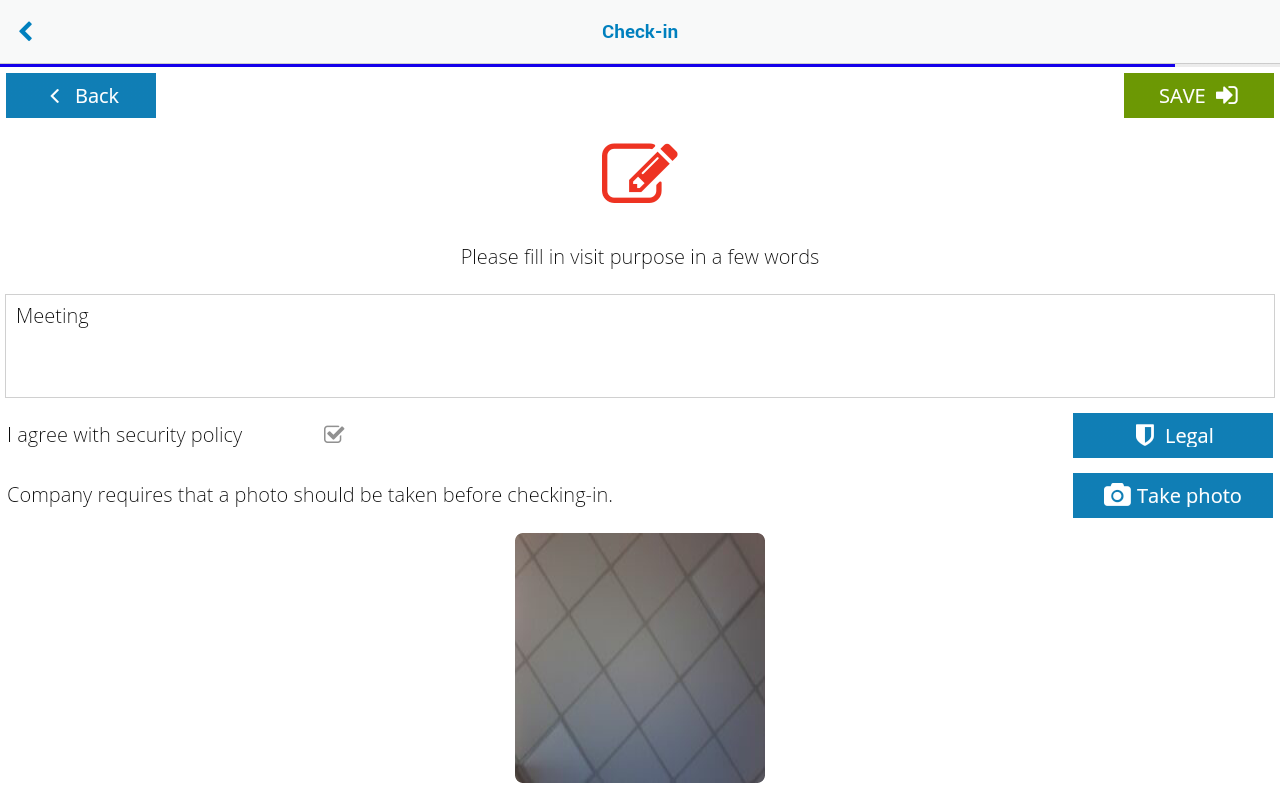 A photo can be taken if the option Take photo at check-in is selected in Visitor configuration.