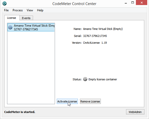 Step 3: Select the Amano Empty Virtual Stick license and press Activate License.