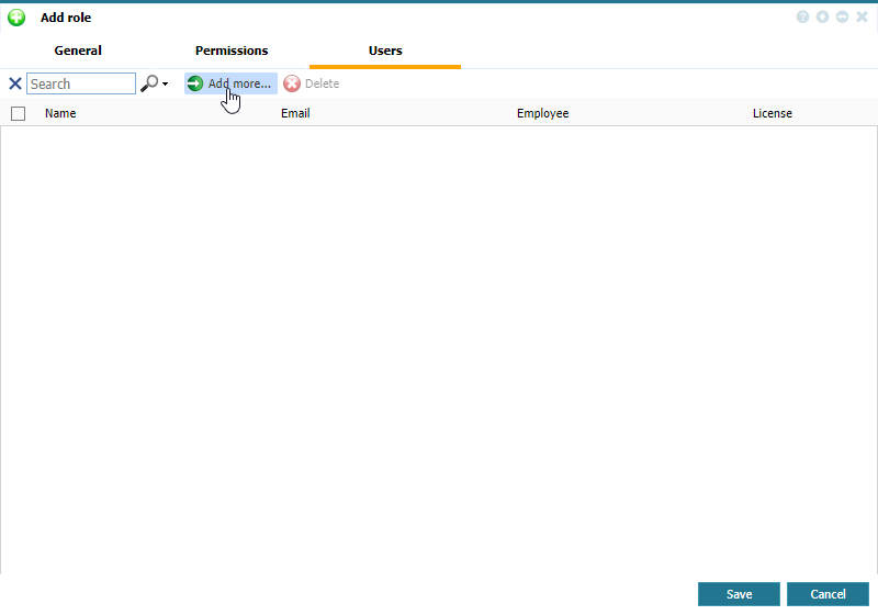 Here you can add users to a role definition in a similar manner to adding permissions to a role. To add a user to a role, go to Security - Roles - Add/Edit role - Tab Users,open the role for editing and click .